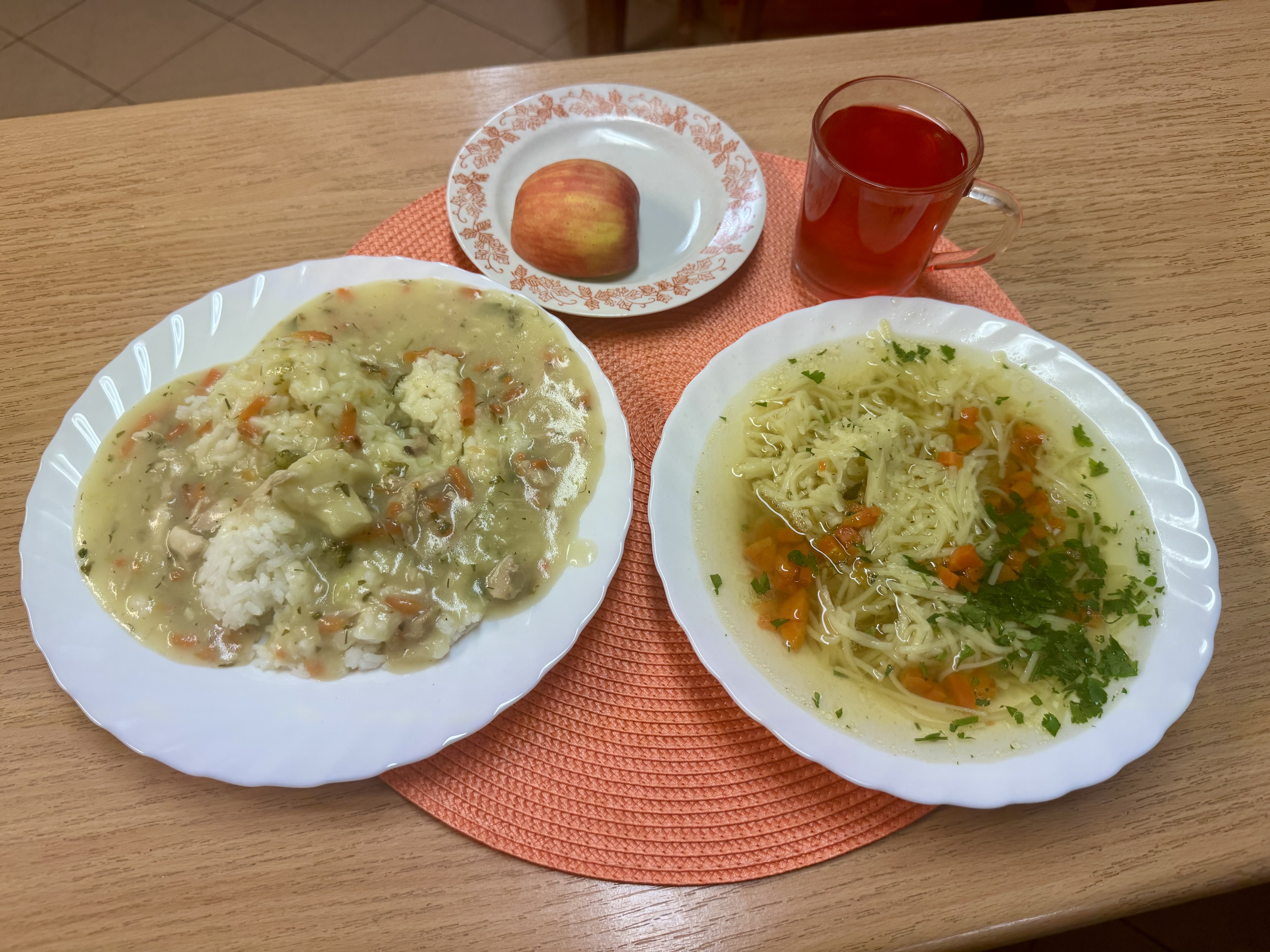 | Rosół z makaronem 300ml (GLU) Risotto z brązowego ryżu warzywami i kurczakiem 300g Jabłko 150g Kompot owocowy b/c 250ml |