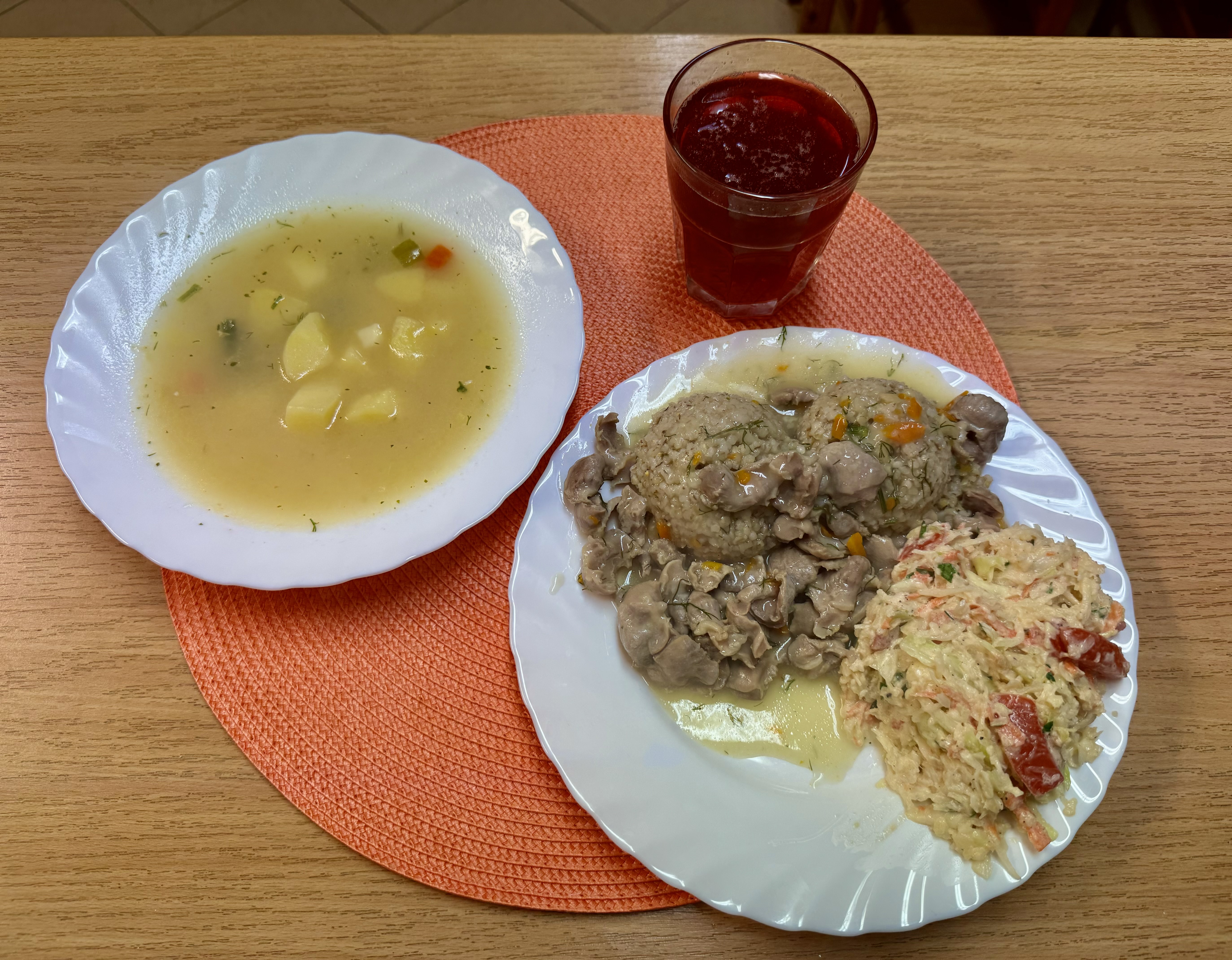 | Zupa jarzynowa z ziemniakami 300ml (MLE) Gulasz z żołądków drobiowych duszony b/mąki 150g (GLU) Kasza jęczmienna 200g (GLU) Surówka z białej kapusty 140g Kompot owocowy b/c 250ml |