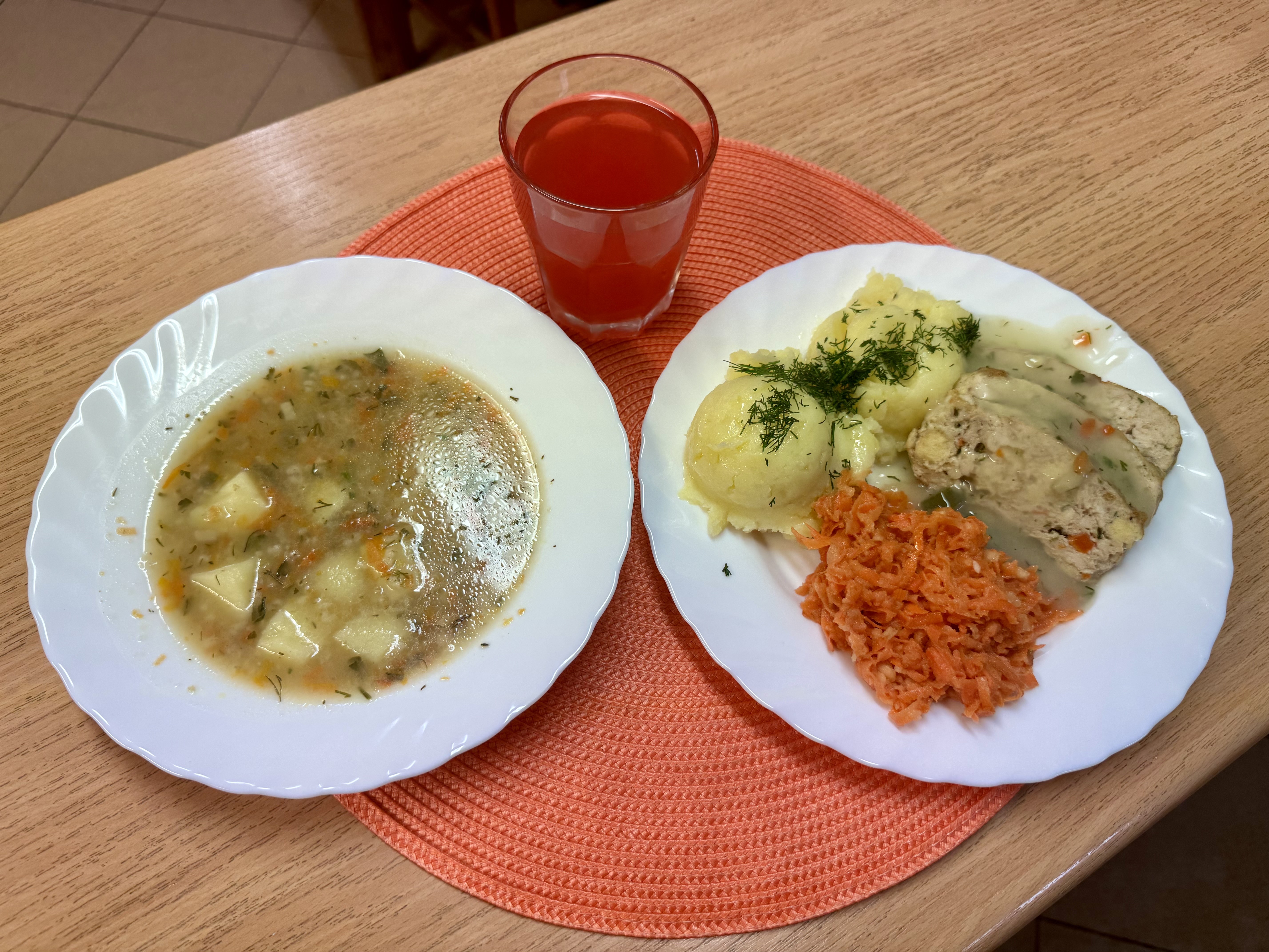 | Krupnik z kaszy jęczmiennej z ziemniakami (GLU, MLE) Rolada drobiowa mielona z marchewką i pietruszką gotowana na parze 90g Ziemniaki 200g Surówka z marchewki i jabłka z olejem 140g Kompot owocowy 250ml |
