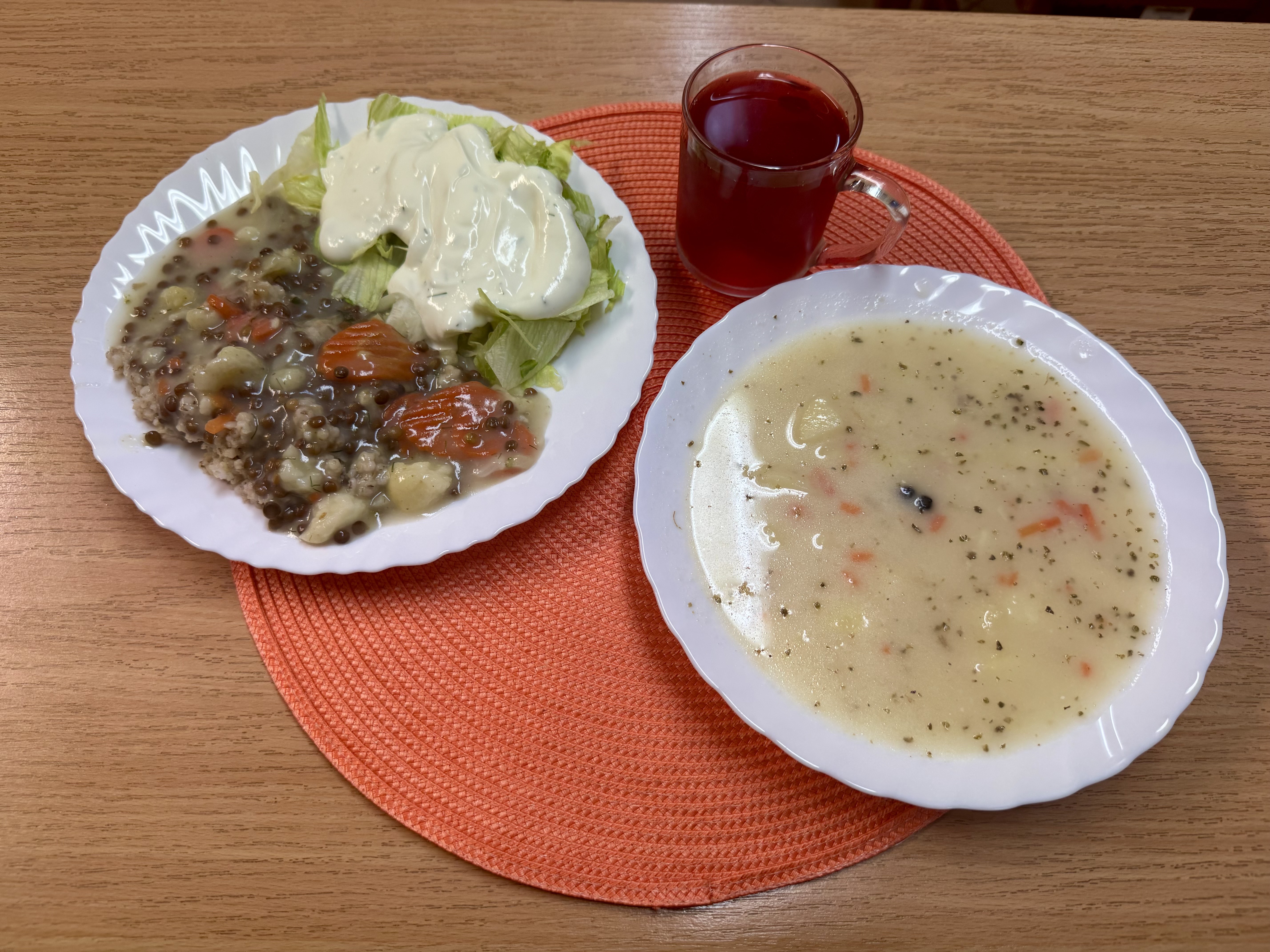 | Zupa biały barszcz z ziemniakami 300ml Kaszotto z warzywami i soczewicą (WEGE) 300g (GLU) Sałata z jogurtem 100g (MLE) Kompot owocowy b/c 250ml |
