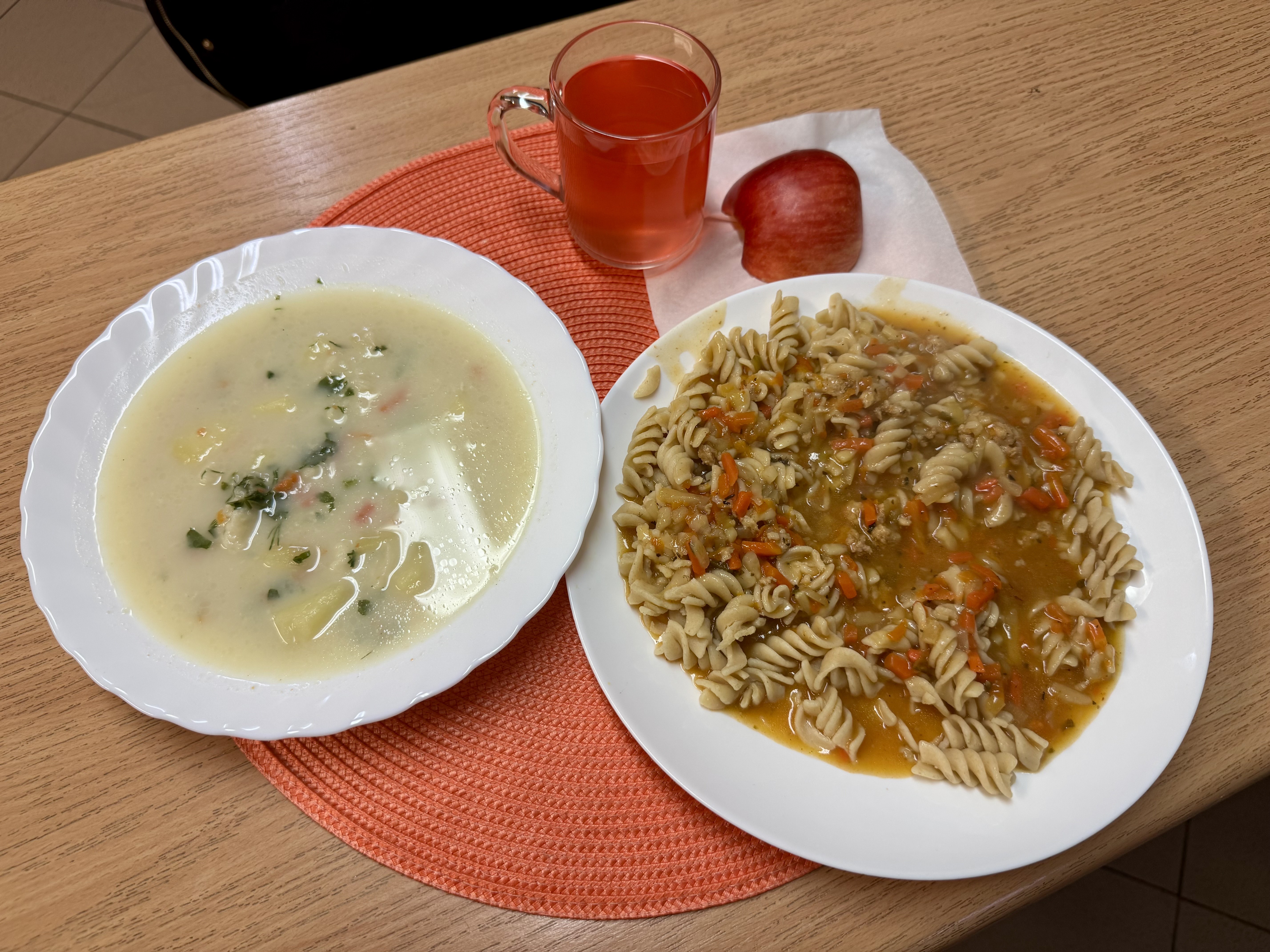 | Zupa kalafiorowa z ziemniakami 300ml Makaron pełnoziarnisty z sosem bolognese 300g Jabłko Kompot owocowy 250ml |