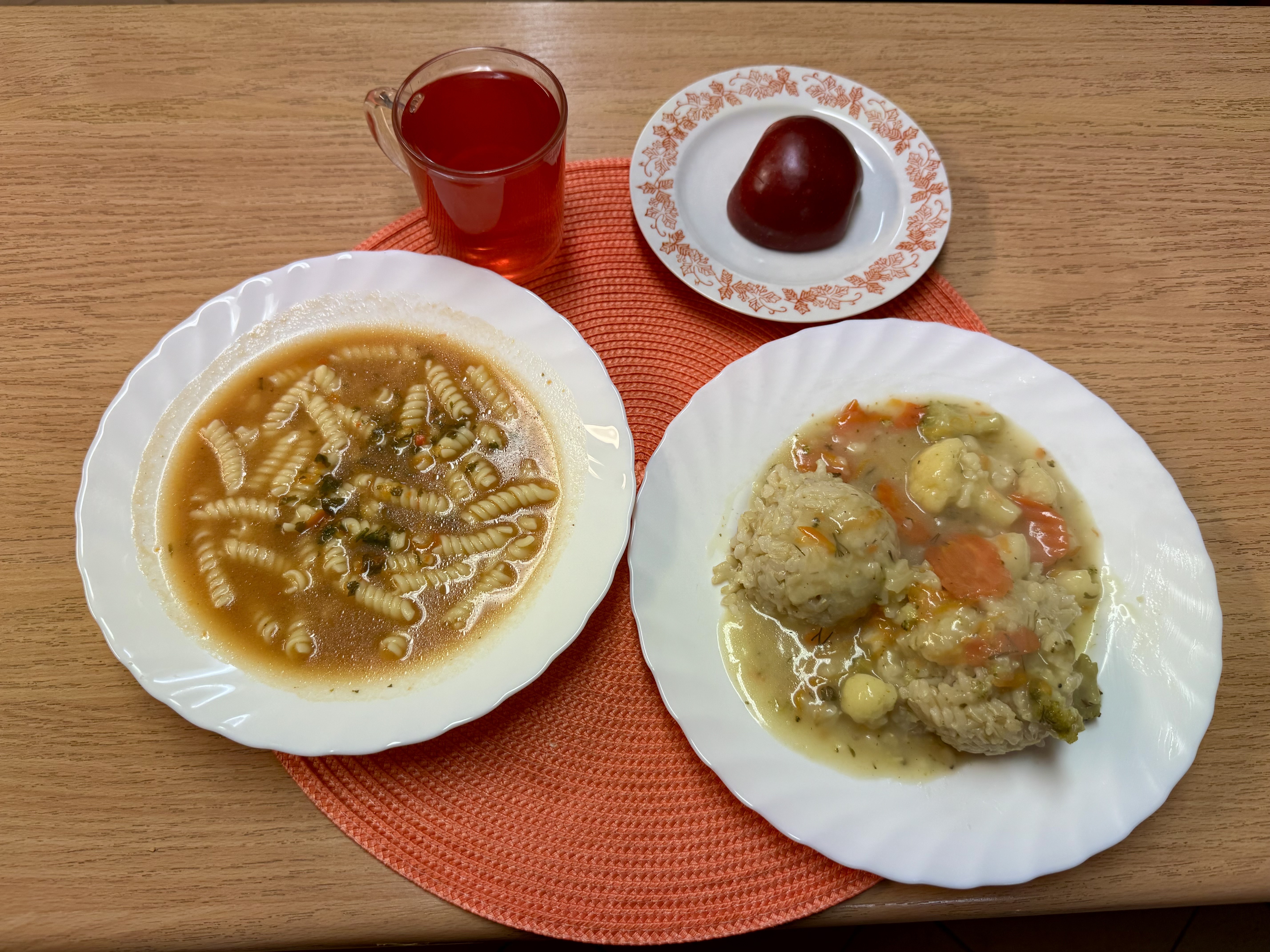 | Zupa pomidorowa z makaronem 300ml Risotto z warzywami 300g (GLU) Jabłko Kompot owocowy 250ml |