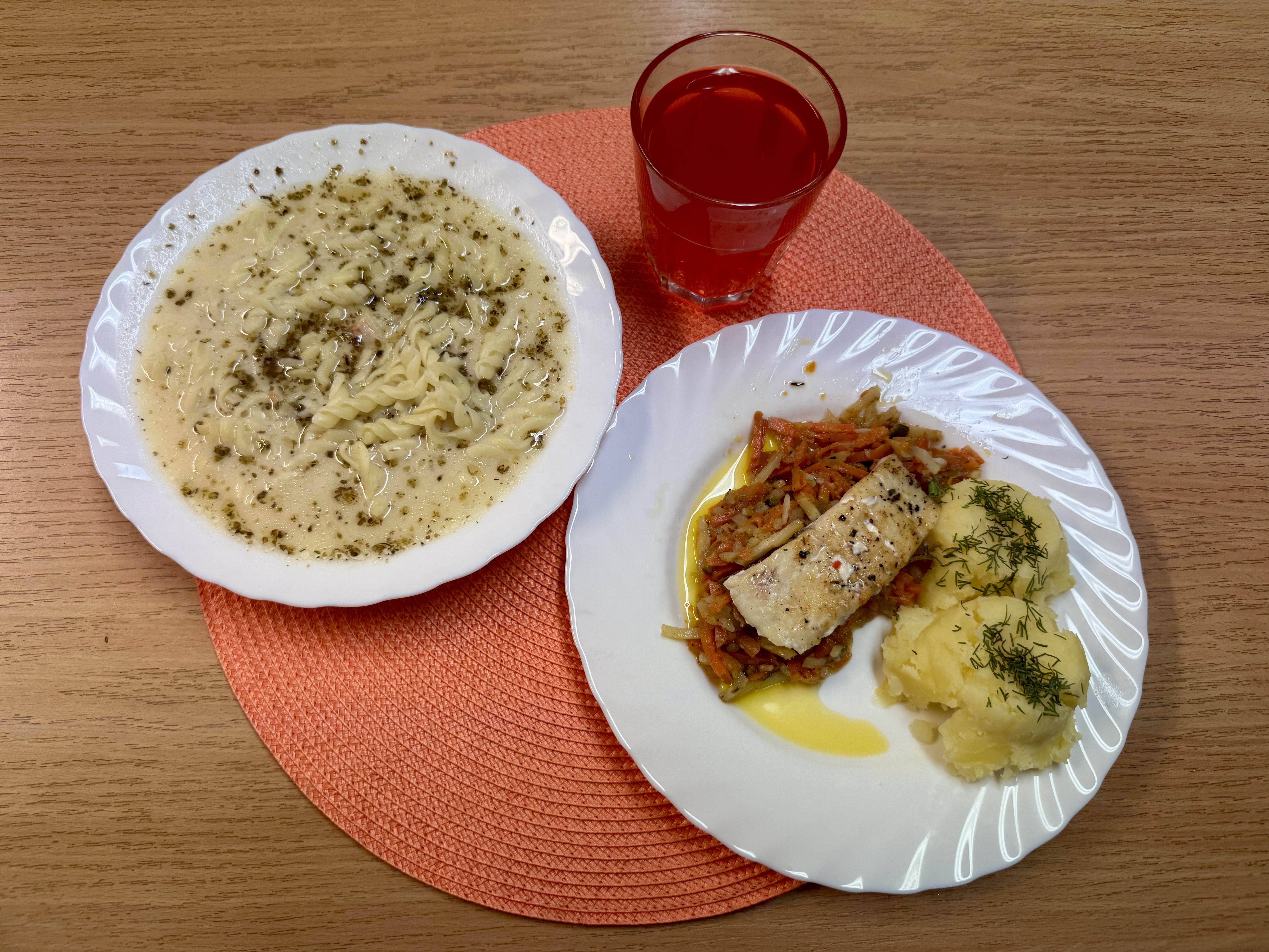 | Barszcz biały z makaronem 300 ml (MLE) Ryba na parze 70 g (RYB) Ziemniaki 200g Warzywa po grecku Kompot owocowy 250 ml |